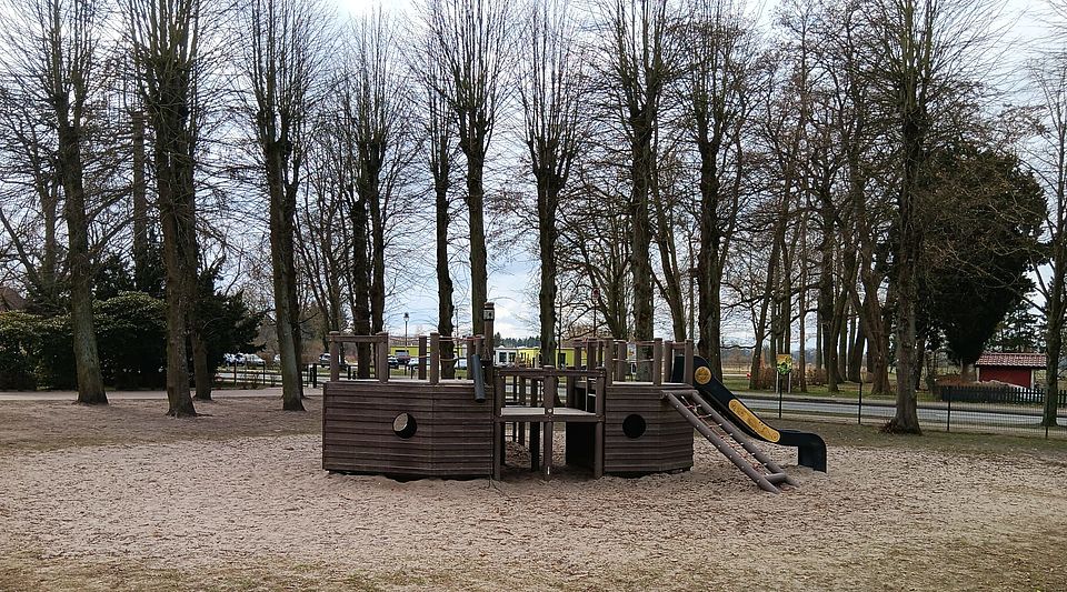 Sie bietet den Kindern vielfältige Möglichkeiten zur körperlichen Aktivität: Ein Kletterschiff mit Hängebrücke, mehrere Balancierbalken, eine Hüpfplatte, ein Klettergerüst, ein Rutschturm sowie eine große Sandkiste sorgen für abwechslungsreiche Spielmöglichkeiten. Für Ballspiele steht ein Platz zur Verfügung, der direkt an den Spielbereich angrenzt und insbesondere für Fußball genutzt wird.