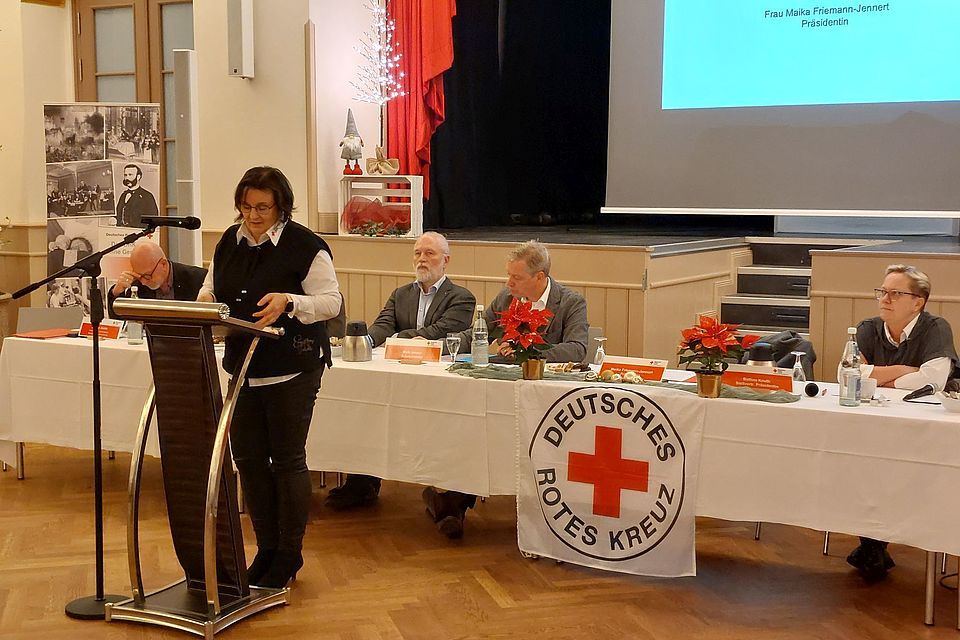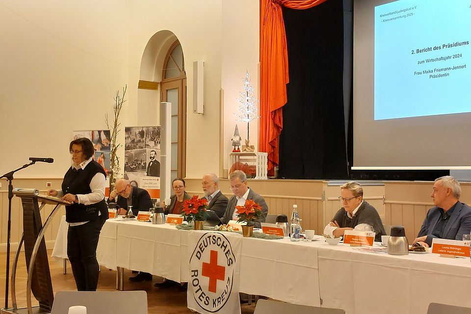 Kreisverbandspräsidentin Maika Friemann-Jennert präsentierte den Jahresbericht des Präsidiums für 2024 und hob die vielseitigen Aktivitäten des DRK hervor – sowohl in den haupt- als auch in den ehrenamtlichen Bereichen. Sie zeigte auf, wie das DRK auch unter anspruchsvollen Bedingungen wichtige Dienste für die Gemeinschaft leistet und stellte die zukünftigen Projekte des Kreisverbandes vor.